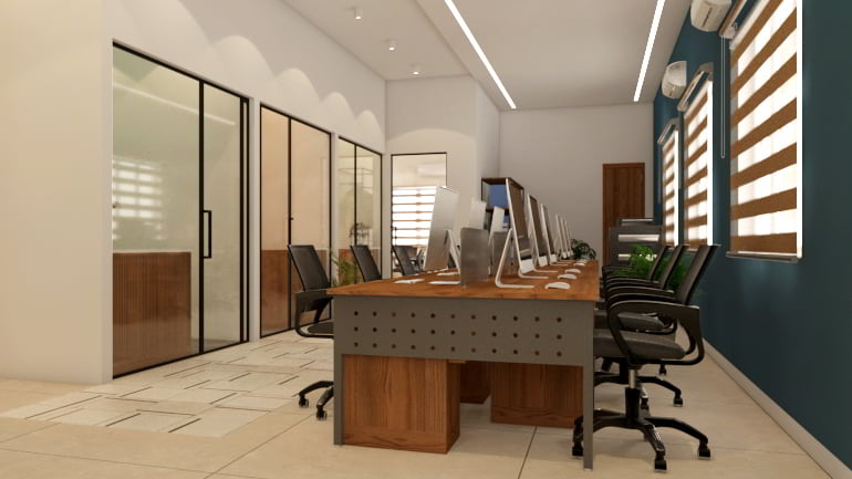 The heart of the office lies in the conference room—a sleek, modern space where ideas flow freely. Teak wood veneer panels line the walls, infusing warmth and sophistication. Natural light dances across the polished table, encouraging productive discussions.