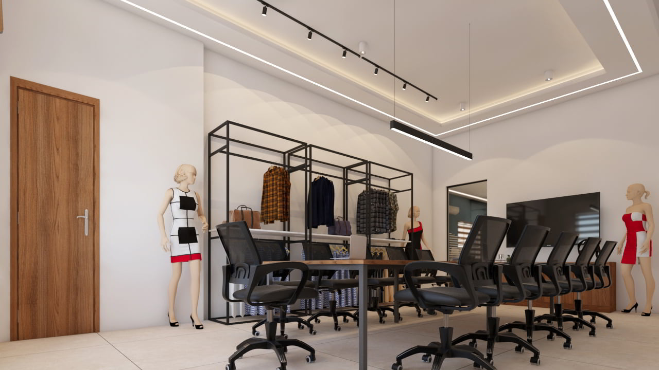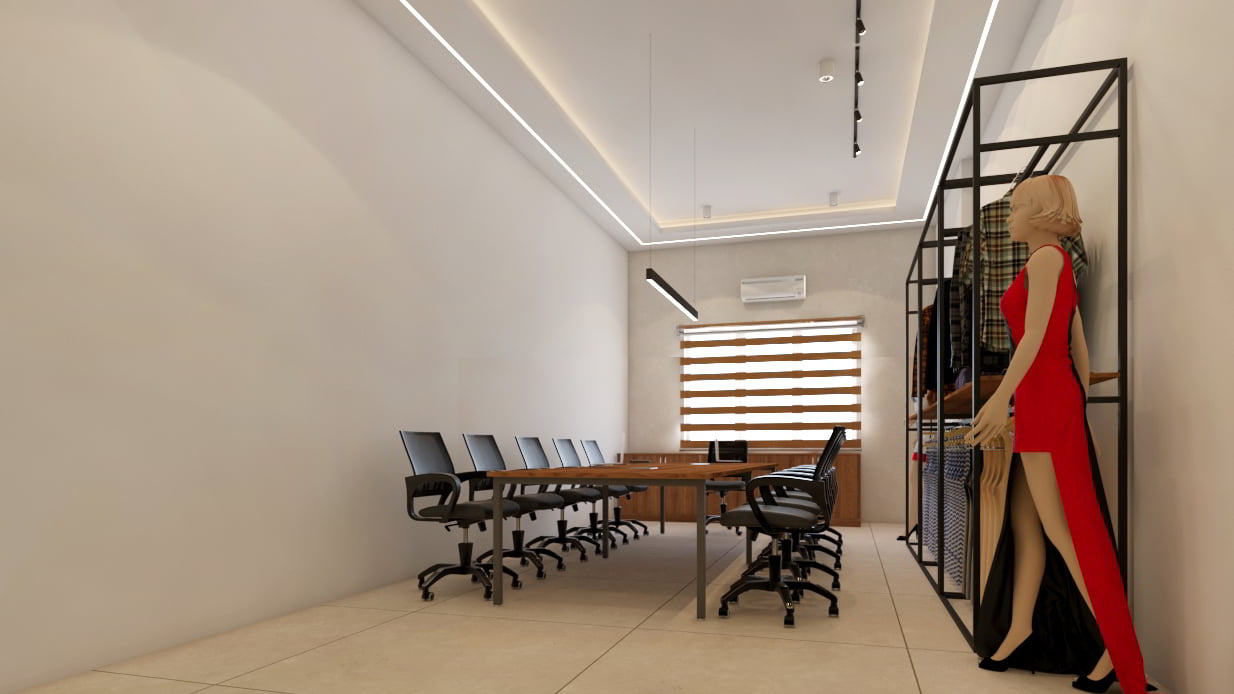 Adjacent to the conference room, the display center showcases Meenakshi’s fabrics and finished products. Here, minimalism reigns, allowing the textiles to take center stage. Pastel tones create a calming backdrop, inviting clients to explore and appreciate the craftsmanship.